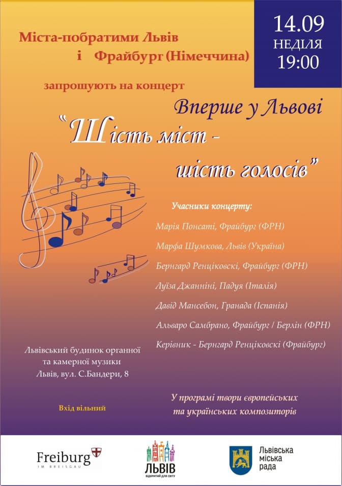 «Ми гордимося партнерством зі Львовом, українським містом, яке включене до Списку світової спадщини ЮНЕСКО. За час нашої співпраці було зроблено багато добрих речей та налагоджено велику кількість гарних міжособистісних контактів. Наше Товариство має на меті сприяти порозумінню між народами та підтримувати розвиток культурних зв'язків між нашими містами. Тому ми з особливою радістю запрошуємо львів'ян і гостей міста на концерт під назвою «Шість міст - шість голосів», у якому виступлять прекрасні солісти з Фрайбурга та його міст-партнерів – Падуї (Італія), Гранади (Іспанія) та Львова», – зазначив голова Товариства сприяння міським партнерствам міста Фрайбург Ганс-Юрген Штадельгофер.