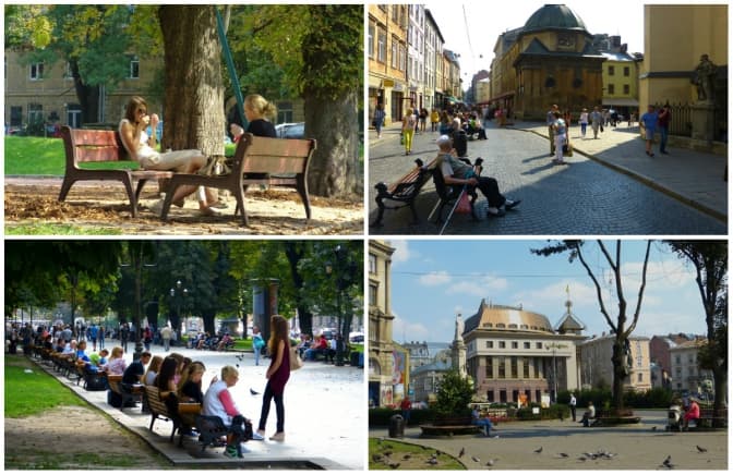 1. У Львові багато вуличних лавок. Зокрема, у парку на Валах, на проспекті Свободи, на вул. Галицькій тощо. Вони, на думку активістів, сприяють спілкуванню та контактами між людьми.