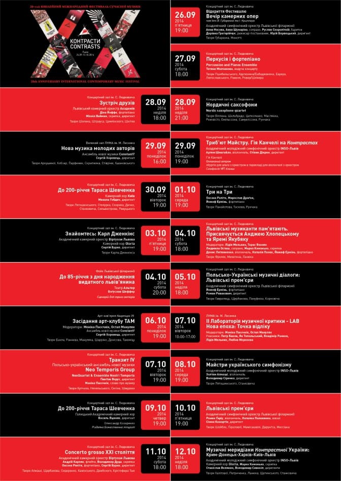 Фестиваль охопить найрізноманітнішу палітру сучасної музики - від класики ХХ століття до найновіших експериментів, також заплановані творчі зустрічі з відомими композиторами, дискусії, традиційних концерти і театральні постановки. Головним запрошеним гостем цього року стане славетний грузинський композитор Гія Канчелі, повідомили у прес-службі Львівської міськради.