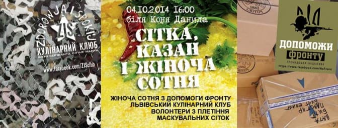 У суботу, 4 жовтня, біля пам’ятника королю Данилу у Львові з 16:00 до 19:00 львів’ян запрошують принести теплі речі для солдат в АТО, а заодно посмакувати кулішем, який там варитимуть. Допоможе варити куліш Львівський кулінарний клуб. Також Жіноча сотня навчатиме плести маскувальні сітки для військових, повідомляє волонтер Люба Возняк. Усіх охочих Подія у Facebook.