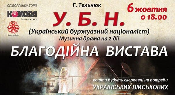 6 жовтня у Львові в театрі Марії Заньковецької покажуть благодійну виставу на підтримку українських військових. Глядачі побачать «У. Б. Н.» Галини Тельнюк, кошти від якої буде благочинним внеском театру для вояків. «У. Б. Н.» або ж «Український буржуазний націоналіст» – це історія про колишнього політв’язня Зенона, який намагається тихо дожити свого віку в компанії спогадів та листів. Але це виявляється неможливим – друзі з минулого, соратники пробують різними способами змусити його знову піти у політику й прикрити своїм незаплямованим ім’ям «брудні» провладні руки, – інформує прес-служба театру. Роль Зенона виконуватиме н. а. України Федір Стригун. Музика у виставі: гурт «Всяк випадок» та Сестри Тельнюк. Початок о 18:00.