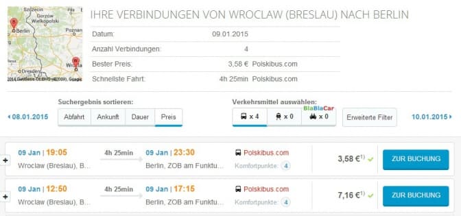 – з Вроцлава до Берліна ми сідаємо на Polskibus, який за 4 години 25 хвилин довозить нас до німецької столиці. Вартість – 3,58 євро (за даними meinfernbus.de) або ж 15 злотих (на сайті polskibus.pl).