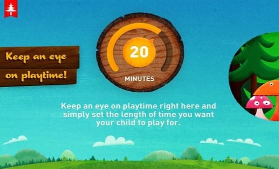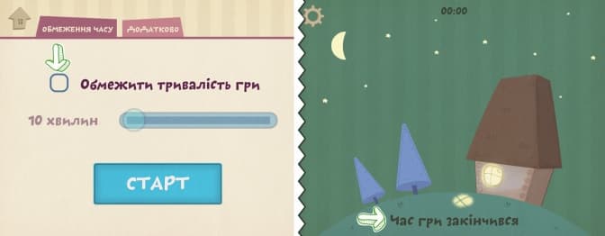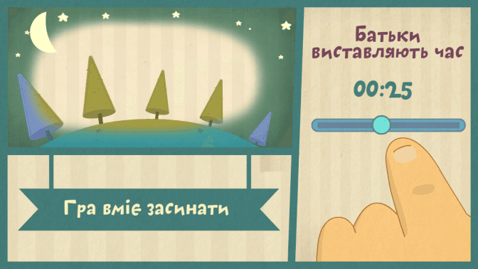 Або приклад української гри “Хто у горах?” з симпатичним задумом “засинання” гри після заданого проміжку часу. Додаток не лише відміряє час, але й пропонує дитині логічне пояснення, чому більше не можна гратися (бо всі герої гри уже сплять!).
