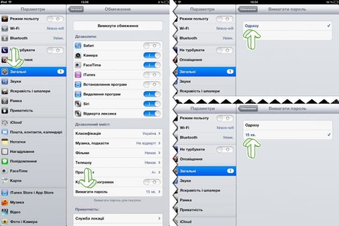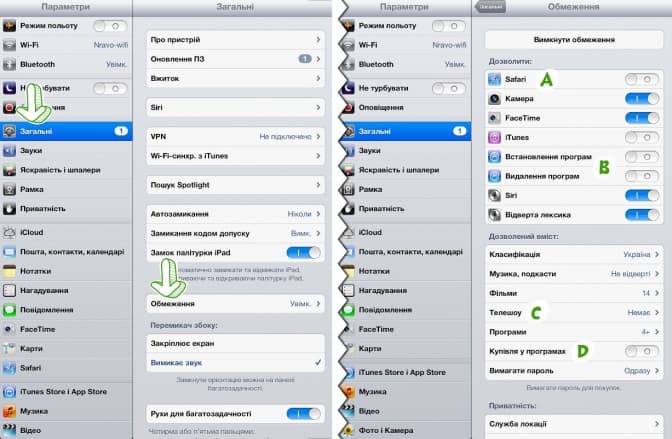 Щодо покупок: щоб повністю відключити функцію купівлі, вимикають відповідні параметри для iTunes Store, iBooks Store, а також вже згадані обмеження «Установки програм» та «Купівлі у програмах».