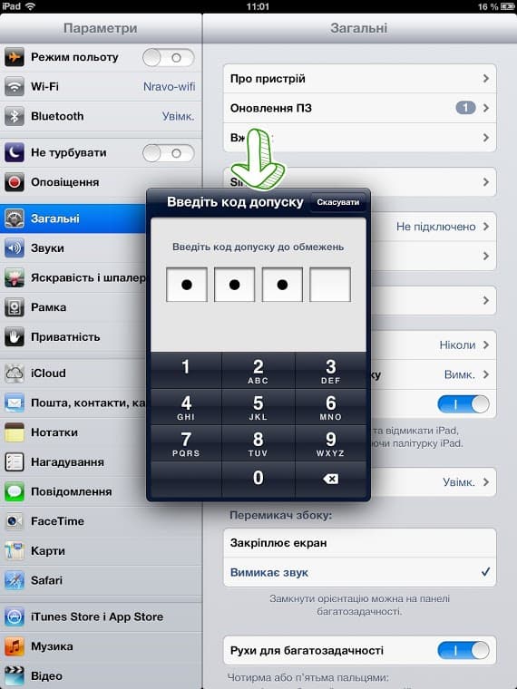 При переході до вмикання обмежень треба ввести «Код допуску». Переконайтесь, що він достатньо складний, щоб дитина його не відтворила, але самі запам’ятайте його, щоб налаштування не стали залізними і непохитними законами користування iPad для всіх користувачів :)