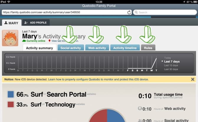 Qustodio Safe Browser і як виглядає аналітика дій дитини: