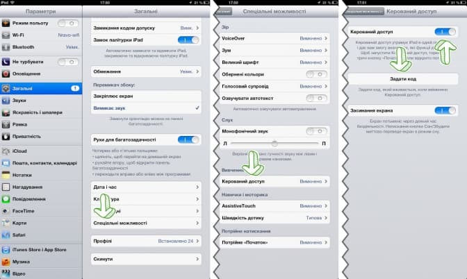 Після того, як керований доcтуп налаштований, і відкрита потрібна програма - слід зробити потрійне натискання на кнопку “Home” на панелі пристрою і ввести код допуску, який ви вводили у налаштуваннях. На екрані з’являться додаткові панелі з кнопками.