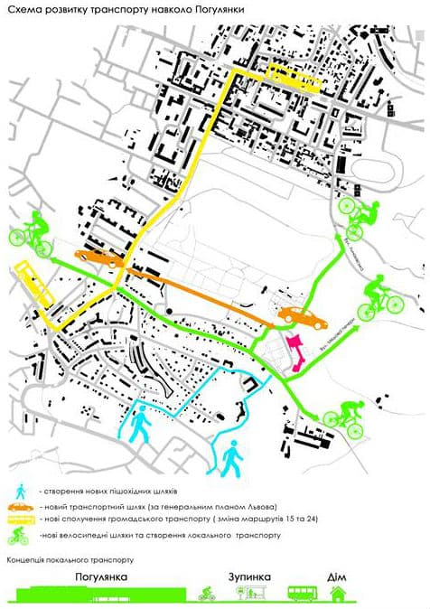 - лінкування території з містом: ревізія громадського транспорту та додавання нової лінії і зупинки автобуса.