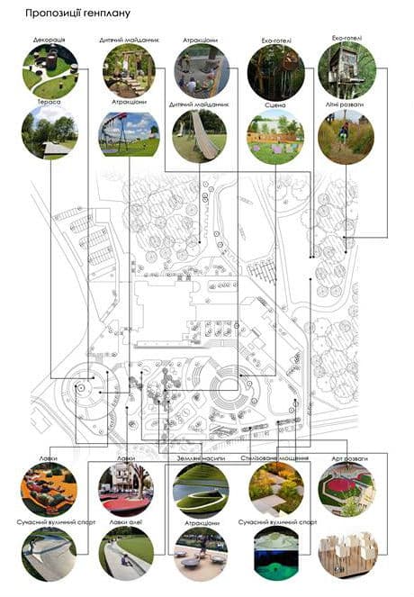 - насичення території новими функціями та більш повне задіяння території: гірки для лазання, елементи для скейтбордистів, обладнання для активного відпочинку дорослих.