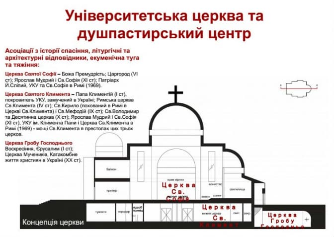 «Будівля матиме кілька рівнів. Верхній рівень – церква Софії (щодо оформлення інтер’єру якої й оголошено конкурс), на нижньому – є ще два храми, які за своєю концепцією є не менш цікавими. Це будуть храми Климента Папи Римського та Гробу Господнього. Тобто, ми відтворюємо подорож у минуле, атмосферу давніх століть», – сказав отець.