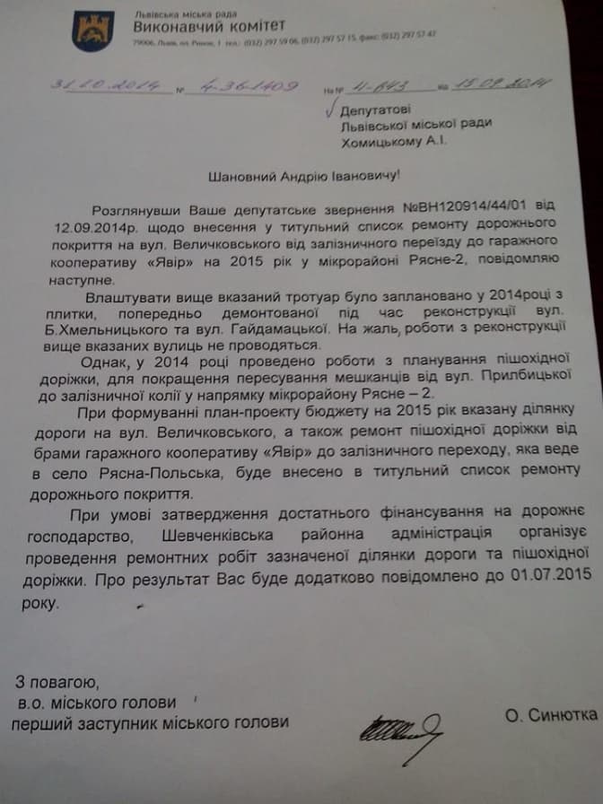 Він зазначив: «Були неодноразові звернення, але коштів на цей рік немає, кажуть чиновники. Та я б не ставив хрест на цьому проекті на цей рік, гадаю, зможемо навести лад. Адже в міському бюджеті періодично звільняються якісь кошти… Взагалі, Рясне-2, фактично, відрізане від міста. Коли там проводили реконструкцію моста, люди не могли нормально потрапити до центру Львова. Вечорами там небезпечно йти з маршрутки, хоча й ходить великий потік людей, – темно», – пояснив депутат.