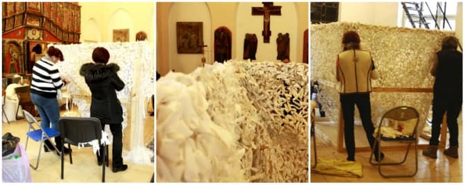 В храмі тепло і пахне ладаном. Навколо багато клунків із ковдрами, одягом, харчами і навіть книгами, які не сьогодні-завтра відправляться на передову. Семеро жінок працюють над маскувальною сіткою. Взялась їм допомагати. Технологія неважка, всі радо працюють і пригадують настанови військових, які консультували рукодільниць: кольорових стрічок не використовувати і головне – зав’язувати подвійні вузли.