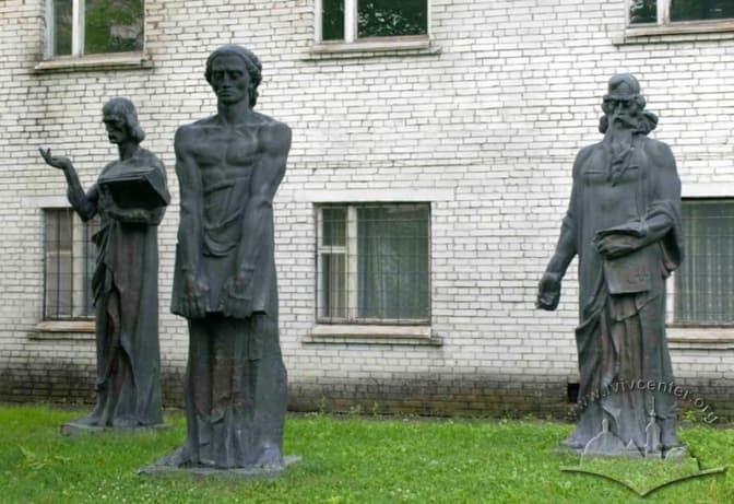 Цей архітектурний ансамбль є дипломною роботою львівського скульптора Анатолія Галяна, випускника Львівського інституту прикладного та декоративного мистецтва (тепер Академія мистецтв). Він становить тематичну трифігурну композицію – друкар та підмайстри. Пам’ятник був споруджений у 1971 р. на подвір'ї церкви Св. Онуфрія на вул. Б.Хмельницького.