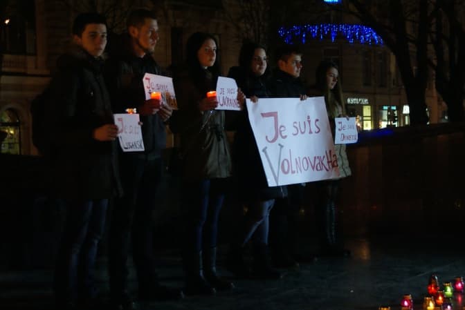 Люди тримали й розвішували плакати солідарності “я Волноваха”, “я Донецьк”, “я Луганськ” та “я Україна”. Вони були двома мовами — українською та французькою.