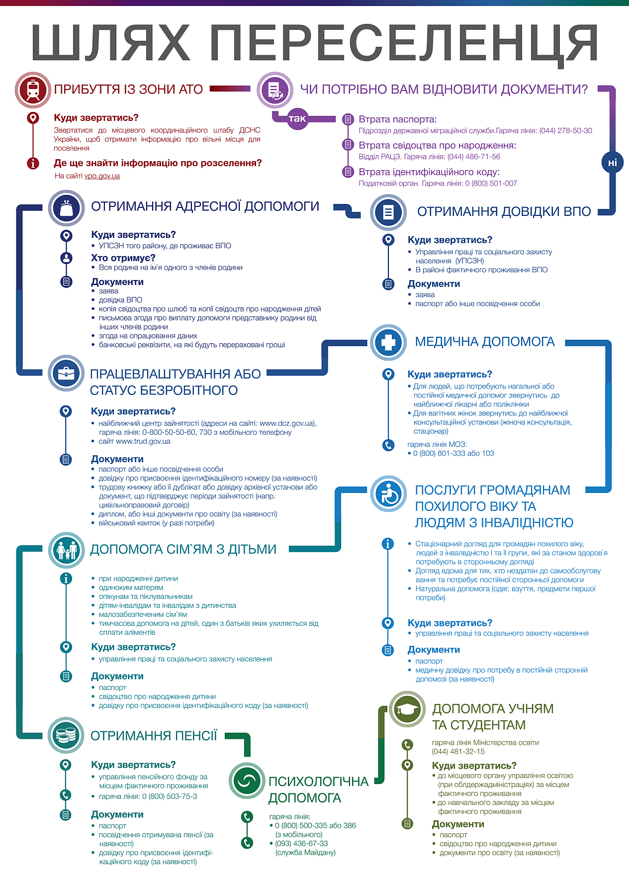 Більше про те, куди звертатись після переїзду із зони військових дій можна дізнатись на сайті або в спільноті у Facebook. Також із нагальними питаннями можна звертатись на гарячу лінію за телефоном 101.