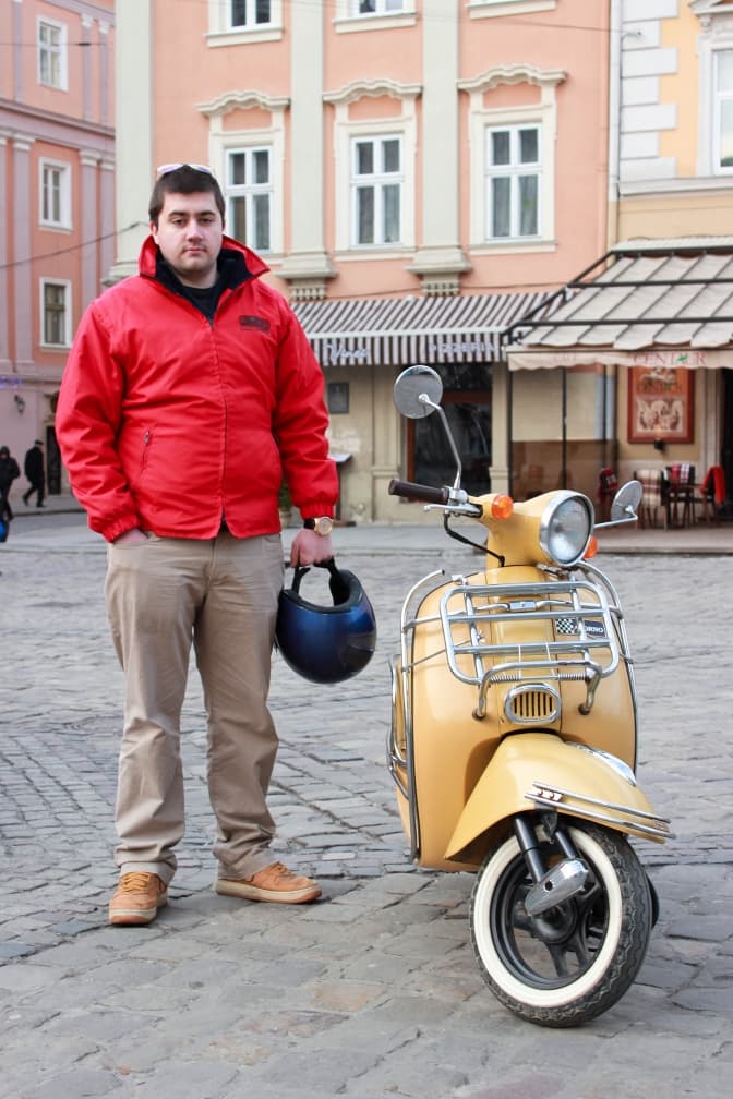 Павло Бідюк, 22 роки, львів’янин. Про ретро-скутер мріяв з дитинства. Свого першого «коня» придбав у 17-річному віці. Відтоді поміняв з десяток моделей. Його захоплення - ретро-скутерами тепер приносить чималий прибуток – хлопець професійно займається їх ремонтом. Сьогодні в «арсеналі» Павла – чотири скутери, радянський моторолер «Тула-Турист» та автомобіль Opel Kadett 1980 року випуску. Весь транспорт, за словами його власника, справний і «на ходу».