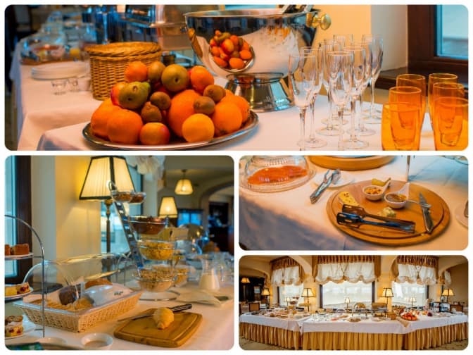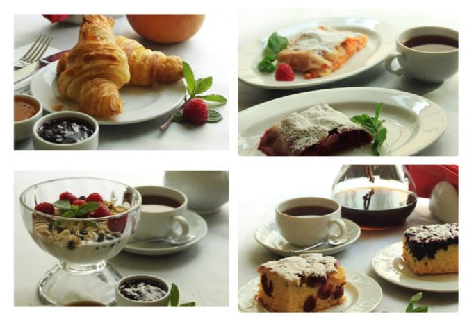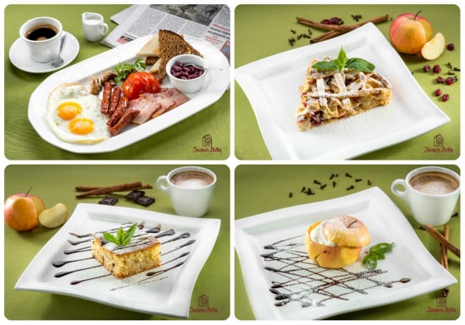 Меню: каша вівсяна та манна на молоці, йогурт з мюслями, млинці з м’ясом, домашнім сиром, або з яблуками, омлети з куркою та сиром, з шинкою та сиром, або з грибами та сиром. Також відвідувачам пропонують сніданок з домашні сиром, сметаною, зеленню, булкою та маслом, сніданок з м’ясною та сирною нарізкою, з маслом та булкою та сніданок з двох яєць із сиром, шинкою, маслом та булкою.