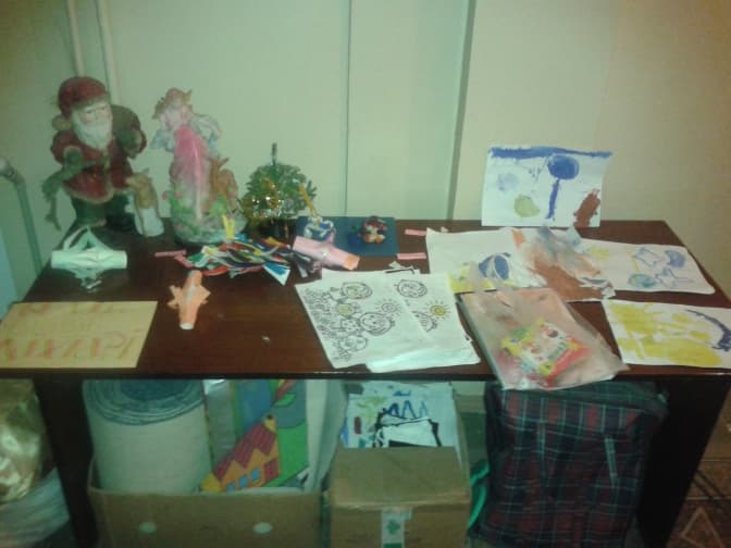 На фото: стіл з дитячими малюнками в коридорі дитячого садочку при церкві св. Климентія