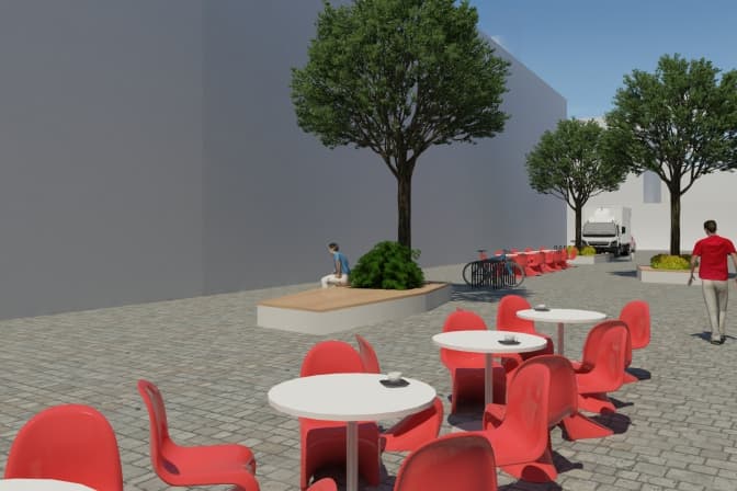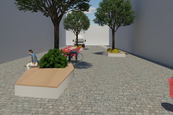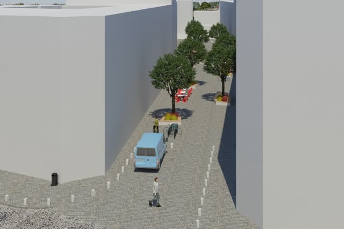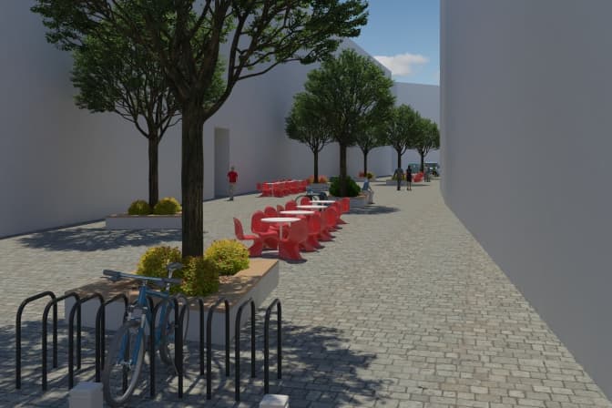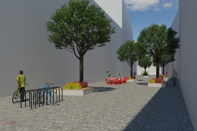 На вулиці планують зрівняти пішохідну та проїжджу частину, висадити дерева, встановити лавки. А от в'їзд на неї повинні обмежувати боларди. Разом із тим, вона має бути доступною для машин швидкої допомоги та пожежників.