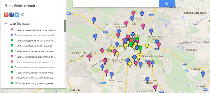 На інтернет-сервісі Google Maps відтепер можна переглянути перелік усіх львівських бібліотек. Всього їх у списку налічується 63. Клікнувши на позначку на карті, користувач побачить адресу бібліотеки у будь-якому районі міста та контактний телефон