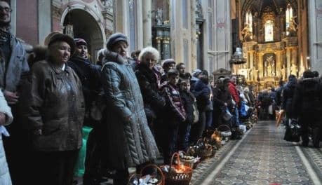 У ХІV столітті святкове богослужіння в католицьких церквах було перенесено з вечора на ранок суботи, коли віруючі збираються у церкві, щоби освятити яйця і воду. Після запалювання нового вогню за допомогою кресала, освячуються свічки, від яких парафіяни запалюють святкові свічки вдома.