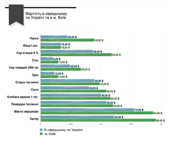 Окрім того, аграрії створили таблицю середніх цін на найнеобхідніші у Великодньому кошику продукти, а також порівняли загальноукраїнські ціни зі столичними.