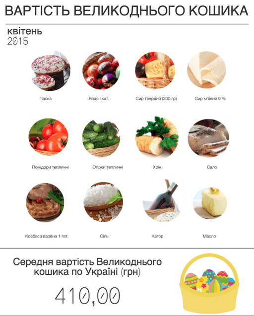 Середня вартість святкового кошика до Великодня цього року становитиме 410 гривень.