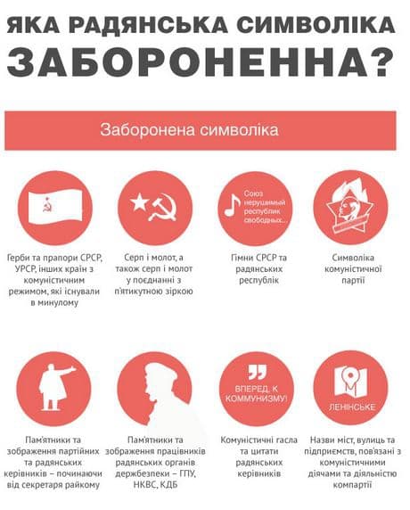 У той же час серед символіки, яка потрапила під заборону, виявилися «назви областей, районів, населених пунктів, районів у містах, скверів, бульварів, вулиць, провулків, узвозів, проїздів, проспектів, площ, майданів, набережних, мостів, інших об'єктів топоніміки населених пунктів, підприємств , установ, організацій, в яких використані імена або псевдоніми осіб, які займали керівні посади у комуністичній партії, починаючи з посад секретаря районного комітету і вище, вищих органах влади і управління СРСР, УРСР, інших союзних або автономних радянських республік, працювали в радянських органах державної безпеки, назви СРСР, УРСР, інших союзних або автономних радянських республік і похідні від них, а також назви, пов'язані з діяльністю комуністичної партії (включаючи партійні з'їзди), річницею Жовтневого перевороту 25 жовтня (7 листопада) 1917 р., встановленням радянської влади на території України або в окремих адміністративно-територіальних одиницях, боротьбою проти учасників боротьби за незалежність України в ХХ столітті».