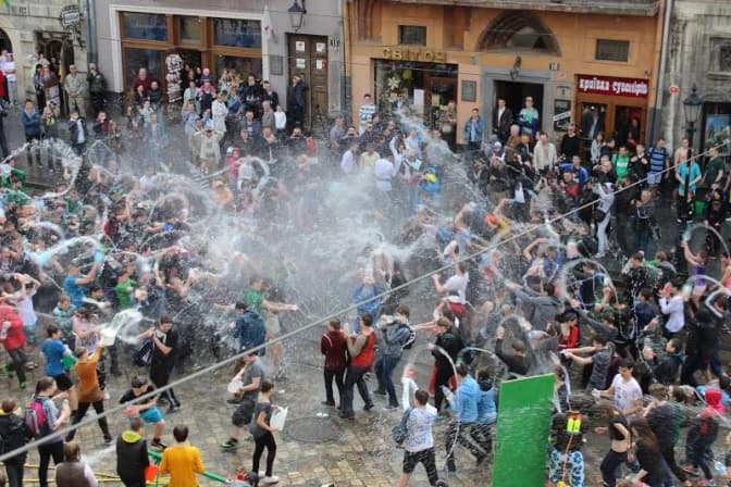 Активна зона для водних ігор та обливання, як і минулого року, облаштована на площі Ринок, перед входом до міської Ратуші. Для цього встановлені спеціальні системи, які подають воду, а також сушки для сушіння волосся. Окрім того, організовано ряд веселощів та водних забав. Всім охочим взяти участь у фестивалі видають пляшки та кульки з водою. Водяні бої на пл. Ринок триватимуть до 18:00 години просто неба.