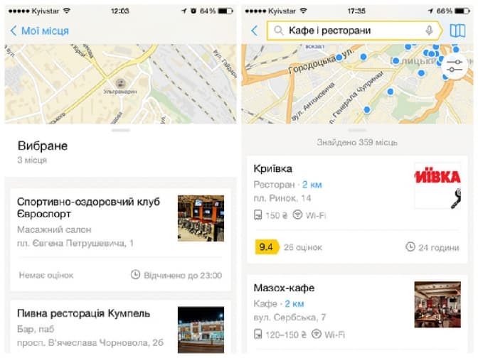 Спростити вибір зі знайдених організацій допомагають рейтинг, фотографії та відгуки користувачів. При цьому Яндекс.Місто враховує не лише оцінки, залишені у програмі, але й зводить дані з партнерських сайтів, на яких люди діляться враженнями. На картці організації доступна докладніша інформація про неї та можливість прокласти маршрут до закладу за допомогою мобільних «Яндекс.Карт» або «Яндекс.Навігатора». Будь-яке місце можна додати до «Вибраного» або зберегти у тематичному списку — наприклад, улюблених ресторанів. А не забути, у якому кафе були незрівнянні десерти, допоможуть особисті нотатки.
