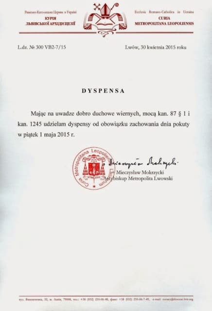 Це звільнення поширюється на римо-католиків, які належать до Львівської архидієцезії РКЦ в Україні. Римо-Католицька Церква в Польщі також звільнила вірних від посту 1 травня. Що ж стосується інших українських дієцезій, то розпорядження архиєпископа Львівського їх не охоплює.