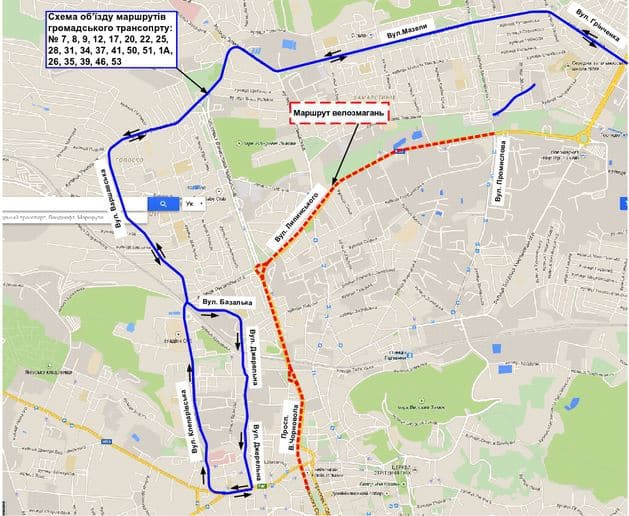 З 8:30 до 13:30 буде перекрито рух транспорту, в тому числі громадського, по вулиці Липинського - від Промислової до кільця проспект Чорновола - Липинського та по проспекту Чорновола - від Городоцької до кільця проспект Чорновола - Липинського.