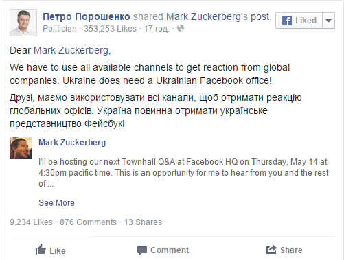 Президент України Петро Порошенко також приєднався до кампанії й зробив адресований Цукенбергу допис на своїй сторінці у Facebook: