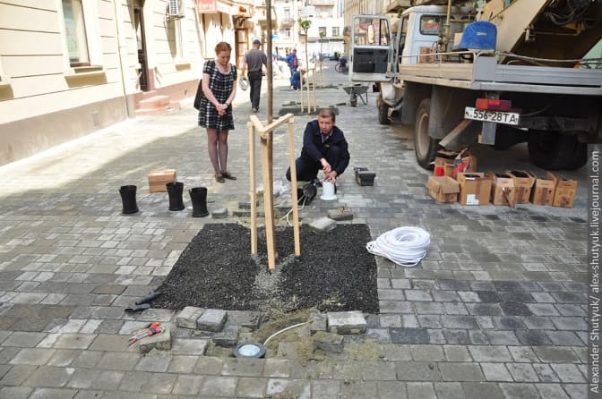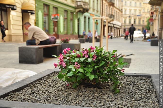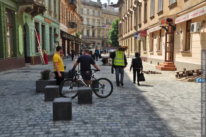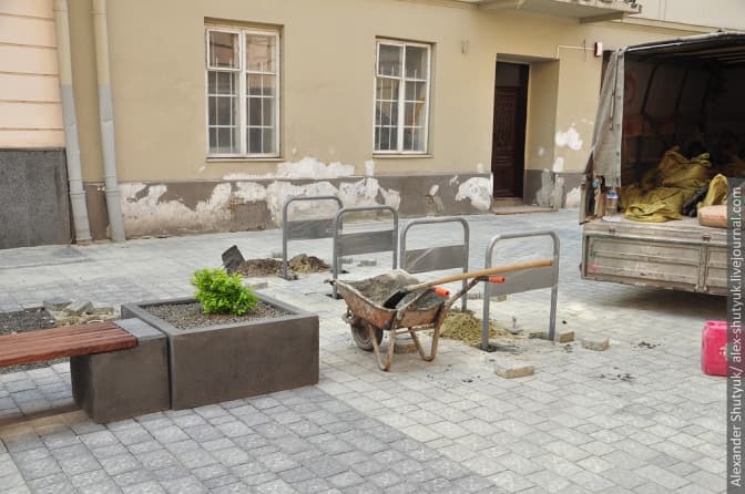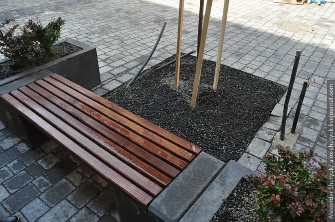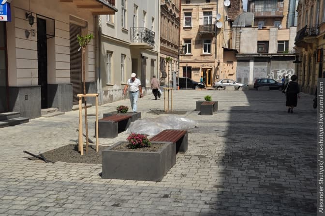 На вулиці Курбаса відбувся черговий ривок: привезли та розставили решту бетонних елементів, змонтували дерев'яні сидіння на лавках та висадили кущі. Окрім того, почався монтаж світильників, ліхтарів та велостійок.