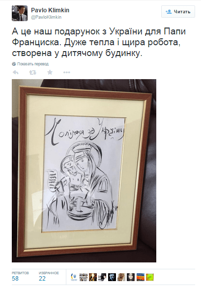 Міністр повідомив, що передав Папі Римському як подарунок із України малюнок Богородиці, намальований в одному з дитячих будинків.