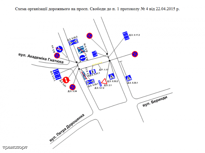 Також вводиться зупинка тролейбусу та додатковий пішохідний перехід через просп. Свободи. Відповідно водії, які рухаються по вул. Гнатюка і бажають повернути наліво на просп. Свободи вже можуть не об’їжджати через проїзд Дорошенка-Беринди, а відразу рухатись прямо. Пропонуємо детальніше ознайомитись з новою схемою руху: