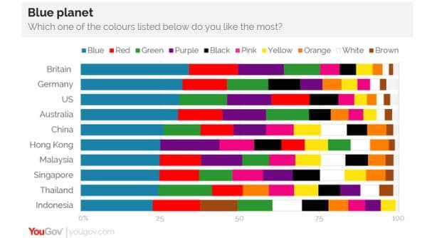 Найбільше синій вподобали мешканці Великобританії (33%), найменше - індонезійці (23%). При цьому у кожній країні, тих, хто назвав синій своїм улюбленим кольором, виявилося як мінімум на 8% більше, ніж шанувальників інших кольорів.