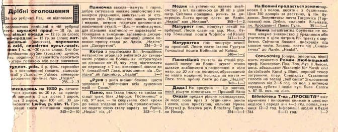 “Кавалєр літ 32 з укінченою середною школою на державній посаді в корінній Польщі шукає цею дорогою товаришки життя. Пані в літах від 22-27 уроджені 27/ХІІ, 11/І. Згл. 20/ІV. – 21/V, релігійні, національно свідомі, милого вигляду, лагідної вдачі з укінченою гімназією згл. семинарією, поважно думаючі о подружі, зволять ласкаво переслати вірний опис свого життя до редакції газети “Неділі” для “Загадка”. Знання французької мови та штука танців не є вимагана , але вміння варити є необхідне. Дискреція під “Словом чести” запевнена”.