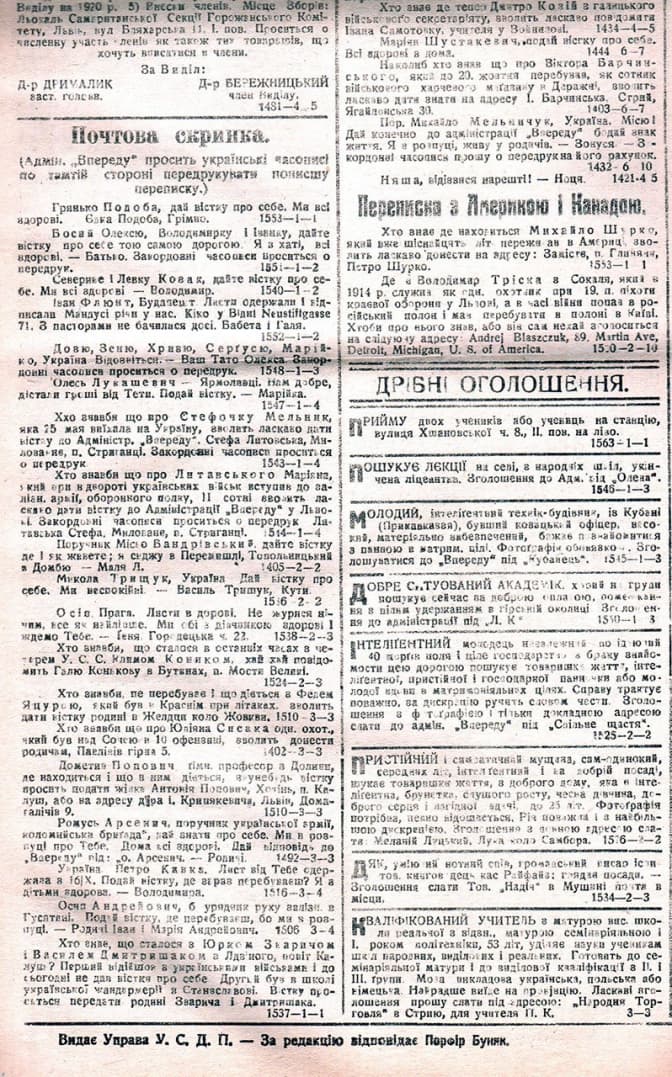 “Інтеліґентний молодець незалежний посідаючий 40 морґів поля і ціле господарство з браку знайомости цею дорогою пошукує товаришки життя, інтеліґентної, пристійної і господарної панночки або молодої вдови в матримоніяльних цілях. Справу трактує поважно, за дискрецію ручить словом чести. Зголошення з фотоґрафією і тільки докладною адресою слати до адмін. “Впереду” під “Спільне щастя”.