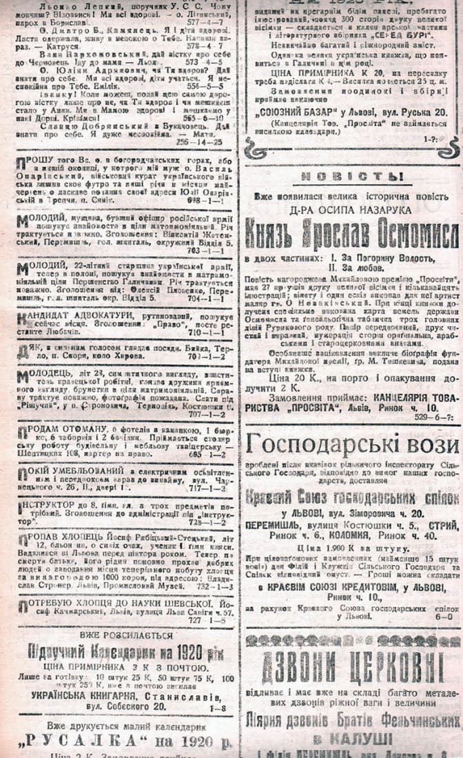 “Хто зазнайомить державного урядника, літ 38 (вдовець), з пристійною, доброю, з доброї родини панною, середного росту від 27-30 літ, шатенкою або темно бльондиною, схоче порозумітися листовно. Найрадше у Львові або Перемишли. Справа під словом чести поважна. Неанонімові листи під “А.К.”, постерестанте [4] Szczakowa до 10 листопада 1919”.
