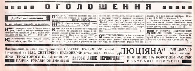 “Пристійний, молодий хлопець, який з причин невідрадних матеріяльних і політичних умовин не може студіювати, навяже переписку в цілі подружжя з пристійною панночкою, до 19 літ, яка моглаб його тимчасово матеріяльно забезпечити, малаб більшу суму на засновання якогось торговельного підприємства, або виробилаб йому добру платну посаду. Зголошення зі знимкою і з поданням даних слати по адресі адміністрації “Неділі” для “спокійний”