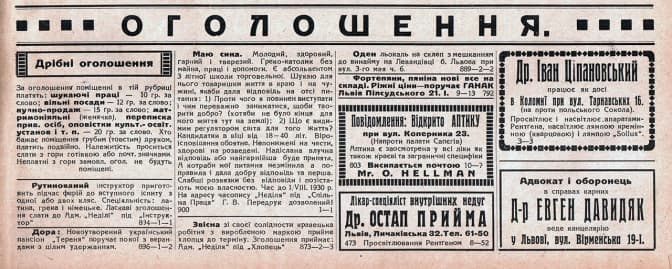 “За оголошення, поміщені в тій рубриці, платять: шукаючі праці — 10 ґр. за слово; вільні посади — 12 ґр. за слово; купно-продаж — 15 ґр. за слово; матримоніяльні (женячка), переписка прив.осіб, оповістки культ.-освіт. установ і т.п. – 20 ґр. за слово. Хто бажає поміщення грубим (товстим) друком, платить подвійно. Належитість проситься слати згори готівкою або почт. значками. Неплатні згори замовл. огол. не будуть поміщені”