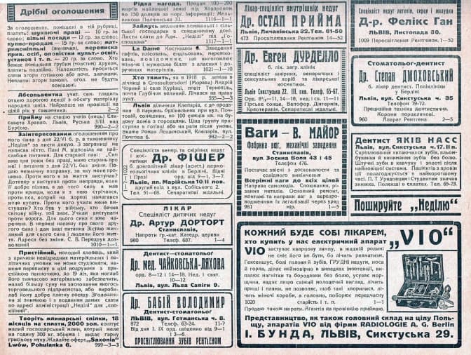 “Д-р. мед. навяже переписку з молодою гарною панною в цілі супружя. Відповідне придане конечне. Зголошення до Адм. “Неділі” під “Амор”.