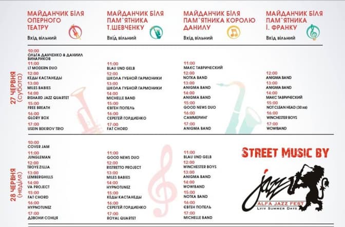 27-28 червня Львів наповниться музикою, адже у найбільш відвідуваних місцях буде розташовано майданчики для вуличних музик.