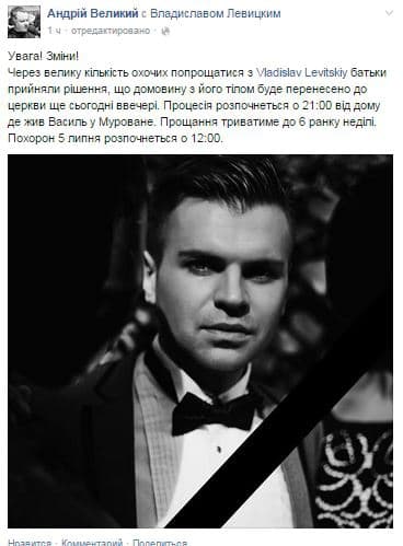 Нагадаємо, відомий український поп-виконавець Владіслав Левицький загинув в автокатастрофі поблизу міста Золочева вночі з липня. Разом зі співаком в автомобілі були його рідна сестра з донькою. Не вижив ніхто.