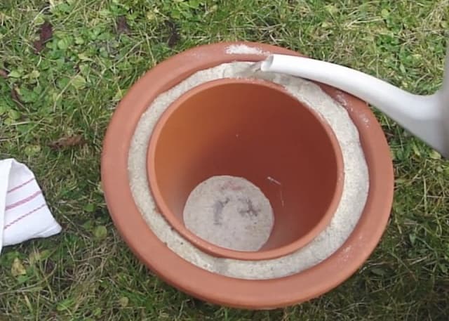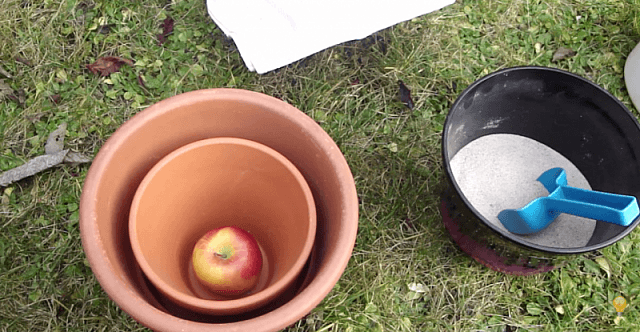 Для невеличкого переносного холодильника необхідно знайти два квіткових горщика різних розмірів, пісок, холодну воду та кришку.