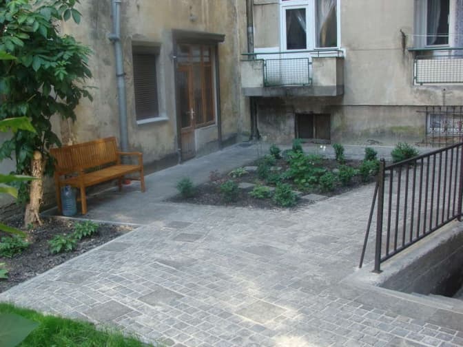 Зокрема, у внутрішньому подвір’ї на вул. Дрогобича, 10 минулого року було розплановано площі двору та замощено бруківкою з граніту. У цьому році впорядковано зелену зону. Були встановлені елементи благоустрою, а саме: пергола та решітки для рослин, лавки для сидіння, дерев’яні лежаки, а також влаштовано газон, висаджено кущі та багаторічні рослини.