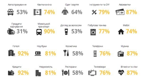 Найбільш популярними категоріями, про які українці шукають інформацію в інтернеті перед покупкою, є: інформація про готелі - у 92% відсотках випадків українці перед бронюванням готелю будуть шукати про нього інформацію онлайн. Окрім того, їх цікавить кредитування фізичних осіб (92%), громадський транспорт міжміського сполучення (90%) та авіаквитки (87%).