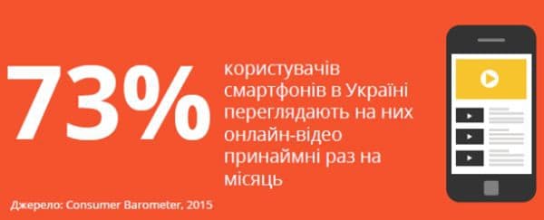 Крім того, смартфони стають одним із найпопулярніших пристроїв для перегляду відео з мережі. Серед власників смартфонів 34% дивляться на них онлайн-відео щодня, а 27% - щотижня. А загалом 73% власників смартфонів вже є регулярними глядачами онлайн- відео за допомогою мобільних пристроїв.