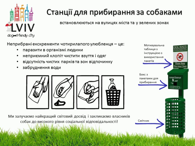 "Метою проекту є встановлення спеціальних станцій для прибирання за собаками на вулицях Львова та у зелених зонах, - розповідає Ольга Кирилович, одна із ініціаторів проекту. - Від звичайних смітників ці станції відрізнятимуться своєю конструкцією: бокс з пакетами для прибирання за собаками, інформаційна таблиця з інструкцією з використання пакетів, смітник".